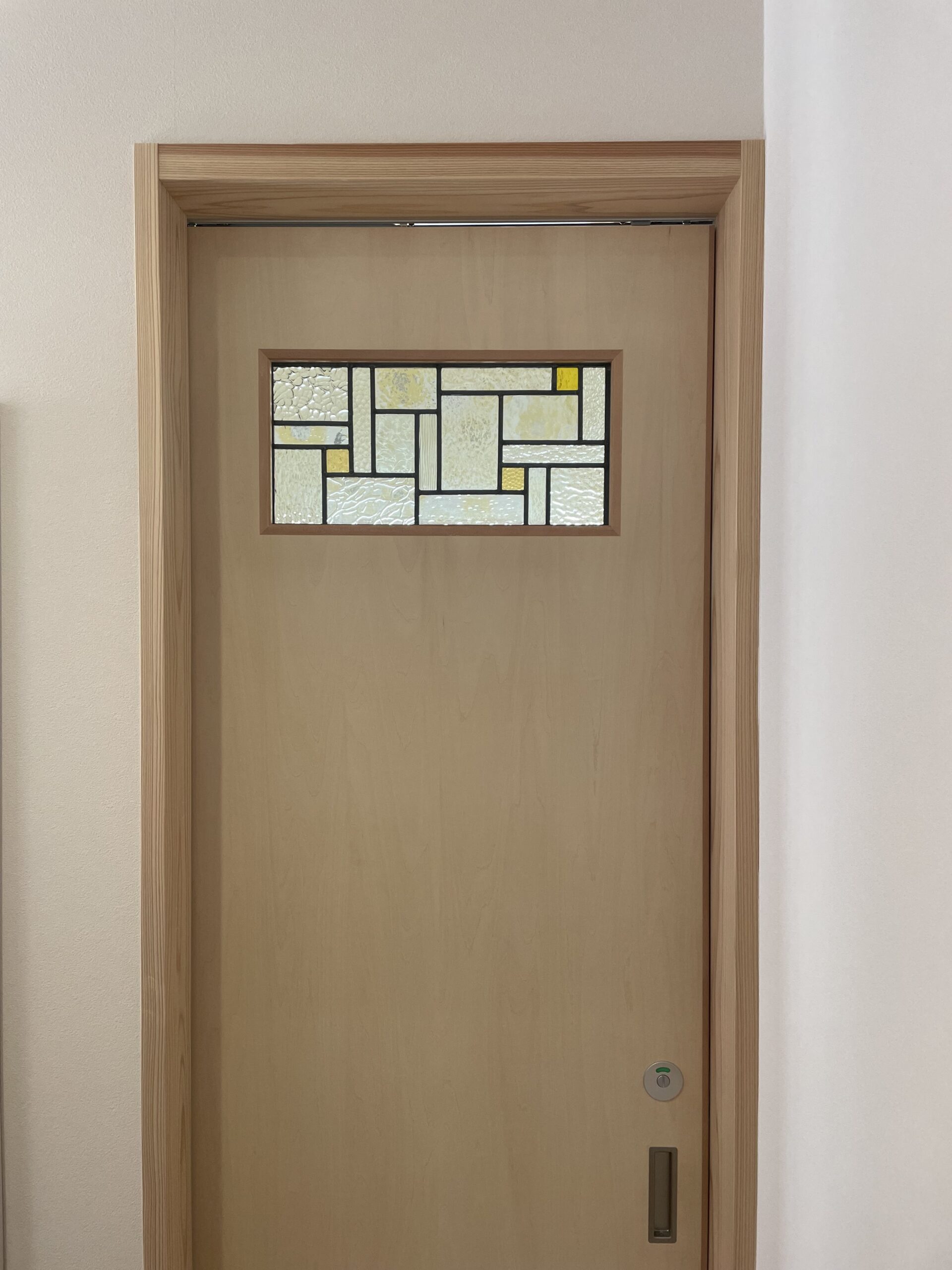 ステンドグラスは奥様がご自身で購入。トイレの小窓に使用しました。トイレドアは造作。