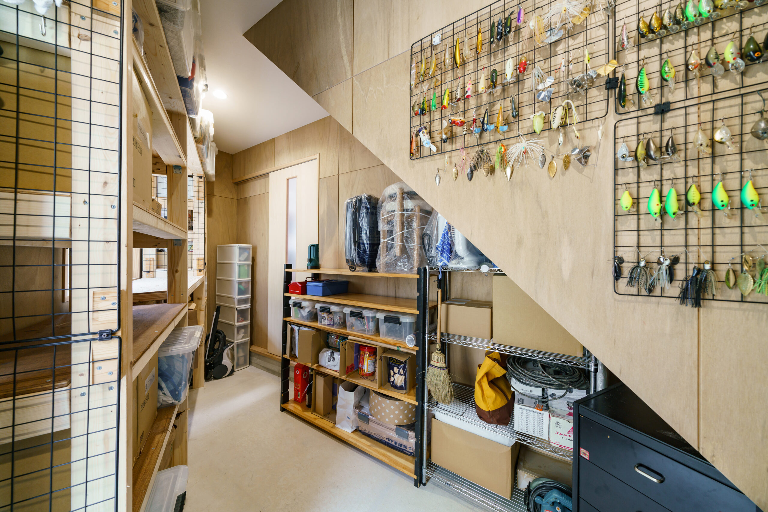 こちらも趣味の釣り道具をディスプレイした土間空間。ルアーがかっこいいです。